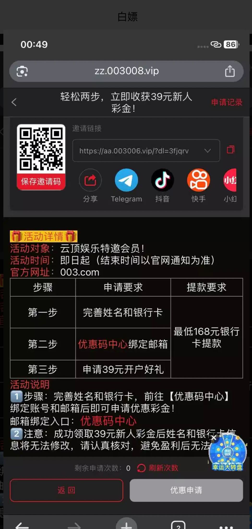 自助彩金39 特邀网址988756.icu 官网003.com 注册先去安全中心绑定手机号跟邮箱 再绑定银行卡 然后去优惠先绑定邮箱 再申请 最低168提现 只可以银行卡 我三个账号都领取到了打出来了一个